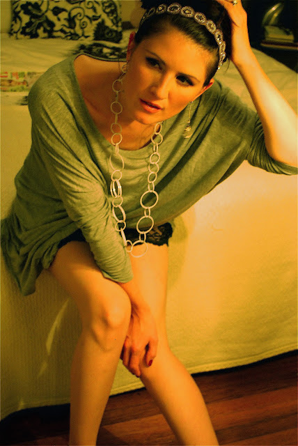 Getting ready (and excited) for a night out with the girls... A comfy, slouchy tee is the right choice paired with a little lacy number, favorite booties, and some fun jewelry.